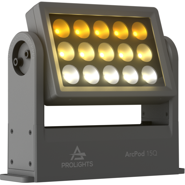 ArcPod 15Q is a compact exterior wash fixture, featuring high-intensity light despite its small size. The unit is equipped with 15x10W RGBW / FC LEDs, delivering an exceptional output over than 5'900 lumens and a wide gamut of colours and whites. The slim sizing, as well as the wide range of available optics, makes the ArcPod 15Q an incredibly flexible architectural fixture to complement the bigger versions in large outdoor installs as accent light or for smaller-sized projects.