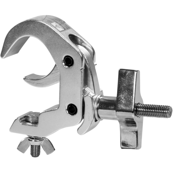 Aluminium truss clamp designed to allow one person to hang heavy luminaires, through the automatic closing with the weight of the object being hung