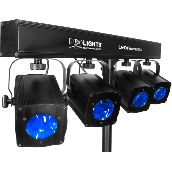 LEDFLOWERKIT4 is an efficient and portable LED solution for lighting yokes reproduction in mobile stages and medium-sized environments. LEDFLOWERKIT4 is composed by a lighting bar with 4 monflower effects based on LED technology, each one equipped with 64 RGBWA LEDs. LED technology allows these fixtures to create striking effects with razor-sharp rotating beams. The power supply and the control unit is contained inside the light-bar, the system includes also a tripod stand and a comfortable travel bag.