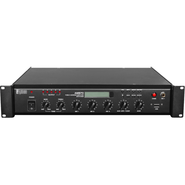 Amplificatore mixer con sintonizzatore FM e lettore MP3/USB integrato progettato per la miscelazione e trasmissione di annunci microfonici e/o programmi musicali nei sistemi P.A.
