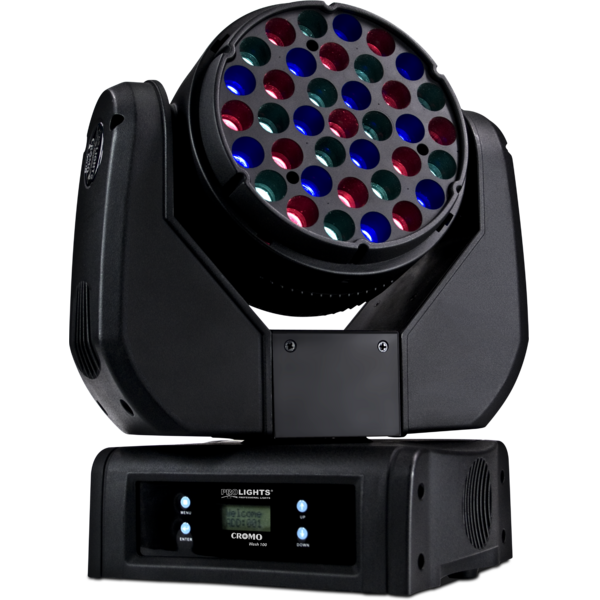 Prolights CROMOWASH100 è un proiettore Led-Washer a testa mobile dalle dimensioni ultracompatte, con grande capacità d'emissione (>2800 lumen) e basato su un sistema di gestione dalle semplici operazioni. La sorgente luminosa si compone di 37LEDs da 3W ad alta efficienza luminosa con sintesi colore RGB (13 rossi, 12 verdi, 12 blu). Il nuovo design del gruppo ottico con guide tubolari è progettato per generare un fascio molto luminoso e direttivo (6°) per performance d'impatto anche in proiezioni a lungo raggio.