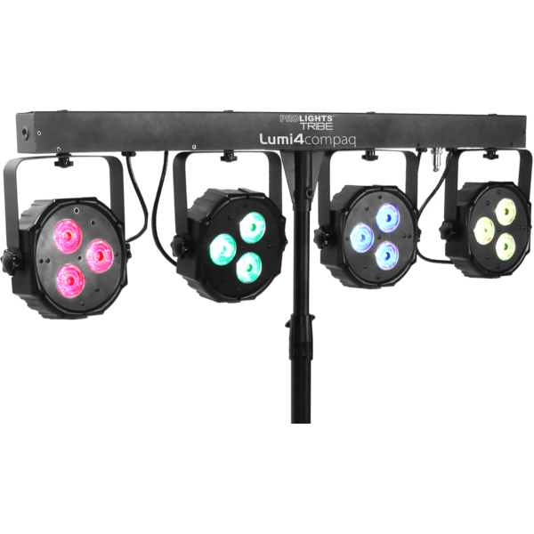 LUMI4COMPAQ è un set di cambiacolori LED portabile plug&play per la riproduzione di giochi di luce in stages mobili e clubs. LUMI4COMPAQ si compone di una barra luci con 4 proiettori a tecnologia LED, ciascuno dotato di 3x9 W LED RGB / FC ad alta efficienza. L'impiego della tecnologia LED consente la riproduzione di effetti suggestivi con cambiamenti di colore dinamici, sincronizzati e potenti. L'unità di alimentazione e di controllo è situata all'interno della barra portafari, il sistema è inclusivo di controllo a pedali, stand tripode e comoda borsa per il trasporto.