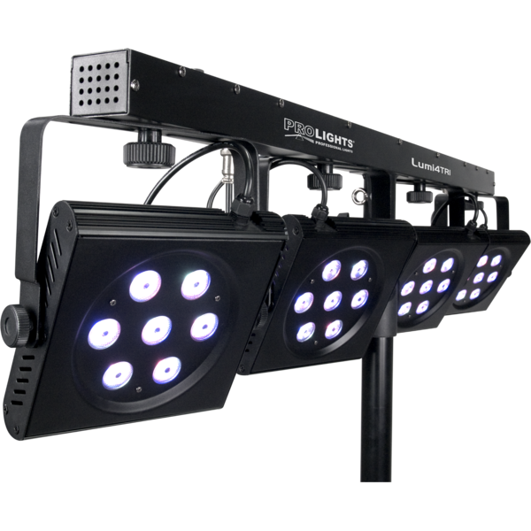 LUMI4TRI è un set di cambiacolori LED portabile Plug 'n Play per la riproduzione di giochi di luce in stages mobili e clubs. LUMI4TRI si compone di una barra luci con 4 proiettori a tecnologia LED, ciascuno dotato di 7 LEDs Tri-color 3W ad alta efficienza. L'impiego della tecnologia LED consente la riproduzione di effetti suggestivi con cambiamenti di colore dinamici, sincronizzati e potenti.