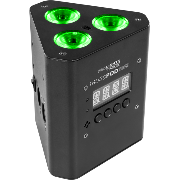 TRUSSPOD3BAT è un proiettore da traliccio con forma triangolare, progettato per essere utilizzato in wireless attraverso la batteria al litio e il controller a infrarossi incorporato. Il suo design lo rende adatto sia per l'uso da terra che per la sospensione ad una truss grazie al supporto a vite. TRUSSPOD3BAT impiega LED 3x3W RGB / FC, con una durata della batteria di oltre 6 ore, ideale come illuminazione da truss, accent light o blinder, in club, eventi o qualsiasi luogo difficile da raggiungere con il cablaggio. TRUSSPOD3BAT è un dispositivo multiuso e facile da usare, grazie anche alla flessibilità di controllo con DMX, auto show, riproduzione di colori statici attraverso il display a LED o il telecomando IR incluso.