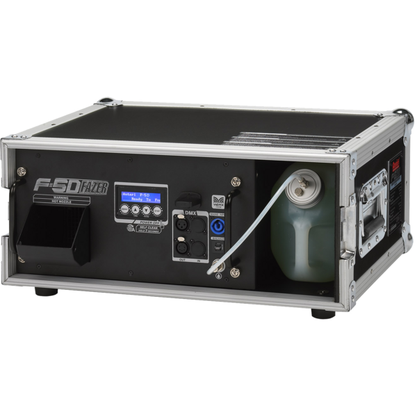 The new stackable F-5D Fazer integrates the features of a rugged flight case in its new packable design. The state-of-the-art air pump system mixes fog and air to produce a fine, dry fog with minimal fluid consumption, for example, one-litre fog liquid will provide two hours of continuous fogging. Performance meets reliability in this new design: the extremely dry fog output leaves no residue, and no liquid is left inside the heater, achieving a longer life cycle for this critical component. The F-5D also features built-in DMX functionality and silent operation, making it suitable for the widest variety of theatrical and stage applications.