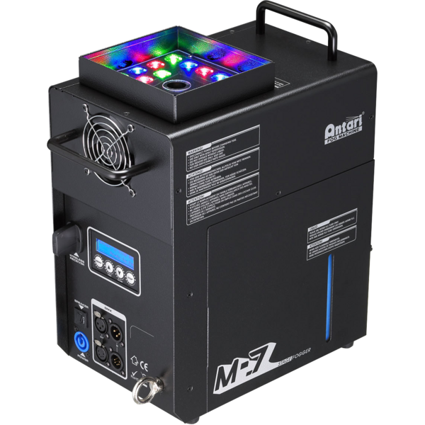 M-7 is the new fog machine by Antari able to emit a high-pressure vertical jet, simulating the special effect that until today has been achievable only with CO2 based machine. The special design of the pump and heater allows an instant emission of start and stop, with a jet which reaches a considerable height, and through the use of specific liquids also the fading is almost immediate in the environment. Thanks to the crown of 22 RGB LED 3W each, M-7 lets you paint the jet of the smoke of any colour, providing unprecedented versatility and creativity. The positioning of the tank inside the machine is fitted for both applications with emission upwards or downwards thereby allowing the assembly both from the ground in suspension.