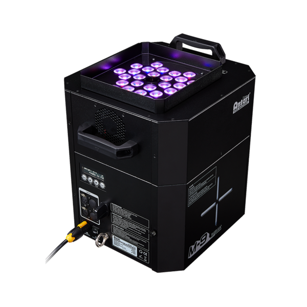 L'M-9 è dotato di LED RGBAW 5 in 1 ad alta potenza per creare un getto colorato nel più ampio spettro di colori possibile. Il design versatile del case consente all'unità di essere montata verticalmente, orizzontalmente o capovolta senza timore di perdite o gocciolamenti grazie al sistema di trasferimento del fluido appositamente progettato da Antari.