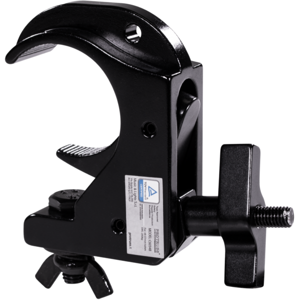 Clamp in alluminio pressofuso per carichi leggeri (SWL 200Kg), compatibile con tubi da 48-51mm. Il design è stato concepito per non graffiare e danneggiare le Truss, assicurando una connessione ultra-rapida mediante soltanto due giri della manopola.