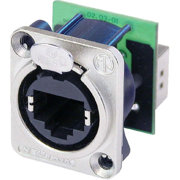 Neutrik RJ45 feedthrough receptacle, D-shape metal flange with the latch lock, mounting screws included.