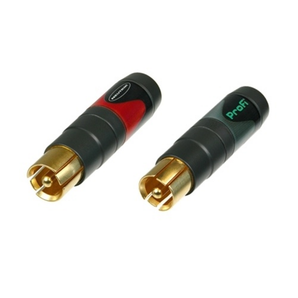 Coppia di connettori Neutrik phono RCA professional, corpi con superficie contrassegnata in rosso e nero. Dotati di 2x2 passacavi per cavi con diametro che vanno da 3,0 mm a 7,3 mm.