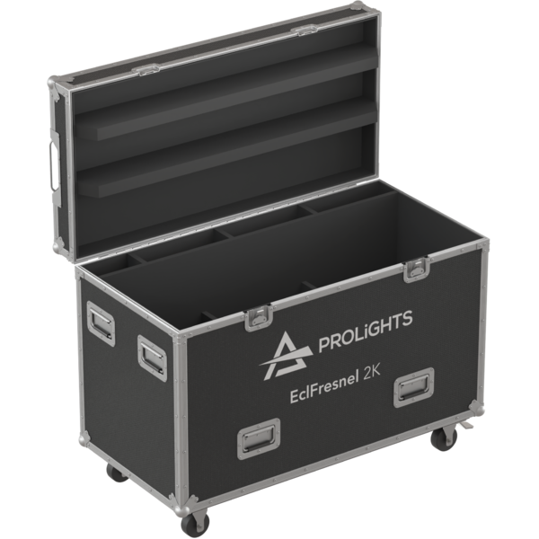 Flight case with internal compartments designed to contain 3 pcs of ECLFRESNEL2K series.