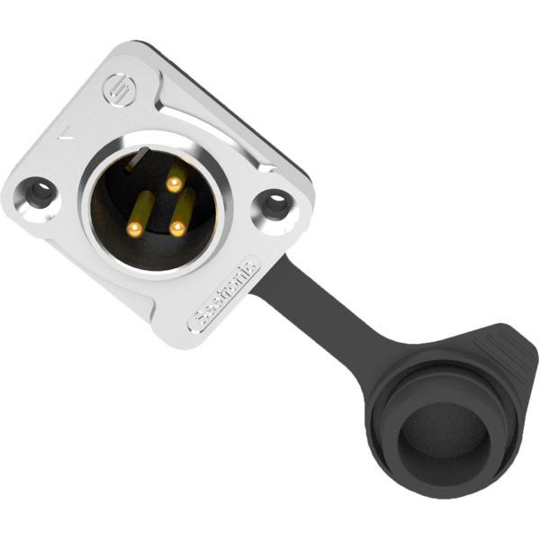 Male 3-pin XLR connector with metal body and protective sleeve in waterproof and dust-proof rubber. Unified size of type D.