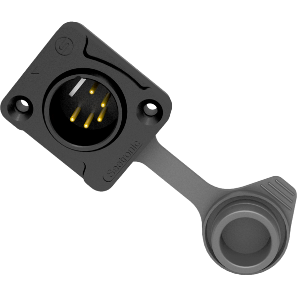 Connettore XLR a 5 poli maschio con corpo in metallo nero e manicotto di protezione in gomma impermeabile e resistente alla polvere. Dimensioni unificate di tipo D.