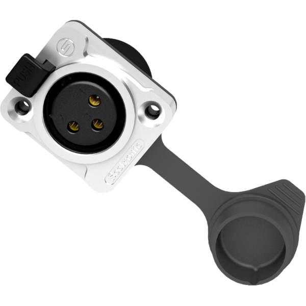 Female 3-pin XLR connector with metal body and protective sleeve in waterproof and dust-proof rubber. Unified size of type D.
