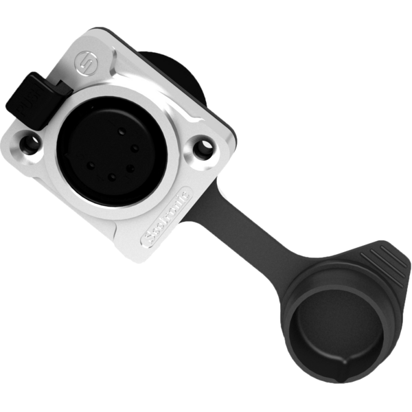 Connettore XLR a 5 poli femmina con corpo in metallo e manicotto di protezione in gomma impermeabile e resistente alla polvere. Dimensioni unificate di tipo D.