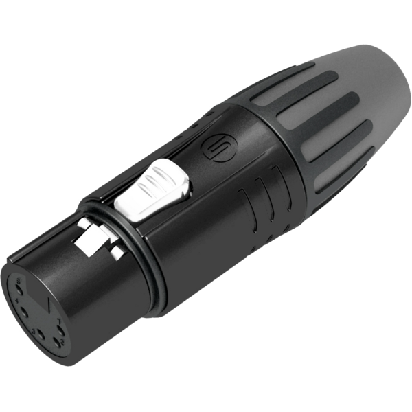 Female 5-pin XLR connector with metal body, black color, for a long life and high reliability.