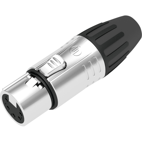 Connettore XLR 5-poli femmina con corpo in metallo, per una lunga durata e alta affidabilità.