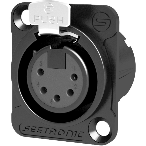 Presa da pannello XLR 5-poli maschio in metallo, colore nero, contatti stagnati. Dimensioni unificate di tipo D e completa schermatura RF.