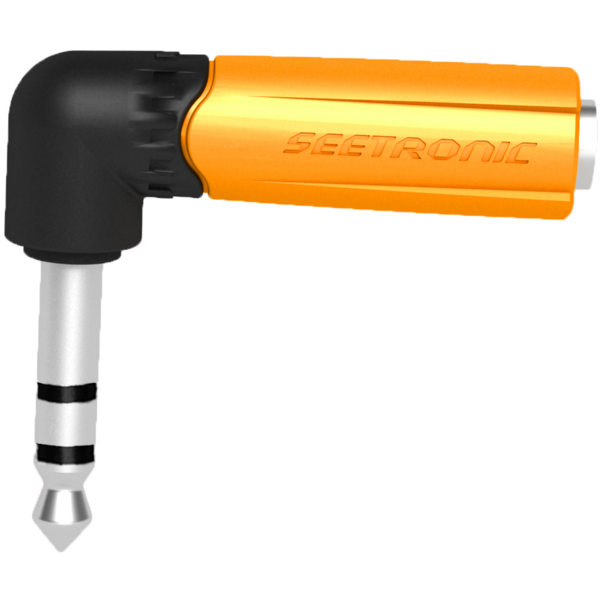 Metal adapter with Ø 6.35 mm jack <=> hole for Ø 6.35 mm jack input, right angle.