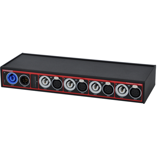 The XSH hybrid splitter allows for distributing power and a DMX signal within one single unit. The XSH features a powerCon 20A input and an XLR input and four pairs of powerCon 20A and XLR outputs. This combination comes especially handy with modern DMX setups, where so-called 'hybrid cables' with XLR and powerCon connectors are frequently used. The XSH comes with a built-in amp meter which makes it a breeze to keep track of the amount of power that is consumed, allowing its user to take action before the cables are operated at their limits. With the RDM option, it is also possible to remotely monitor the current draw.