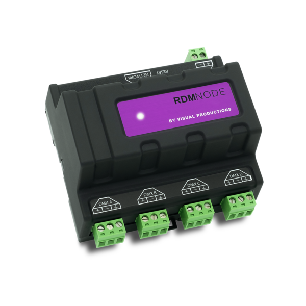 Il RdmNode è un nodo eDMX a 4 porte progettato per convertire senza problemi Art-Net e sACN in DMX-512 e viceversa. Il suo compatto formato per guida DIN lo rende una scelta eccellente per l'integrazione nei sistemi e nei progetti di illuminazione architettonica.